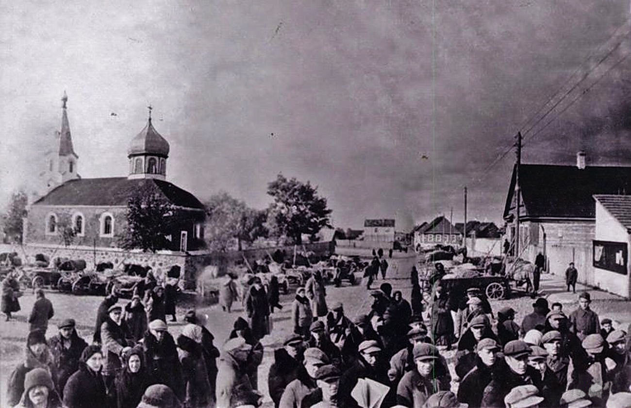 Митинг, посвящённый объединению Западной Беларуси с БССР, слева - Спасо-Преображенская церковь (теперь - ул.Кирова-Танкистов), сентябрь 1939 г.